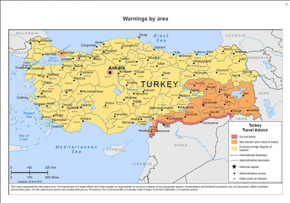 Areas bordering Syria: The conflict in Syria and Iraq further increases the threat of terrorist attack throughout Turkey. The threat is highest along Turkey's long and porous border with Syria. We advise you to reconsider your need to travel to any area within 50 kilometres of Turkey's border with Syria and not to travel within 10 kilometres of the border or to the city of Diyarbakir due to the high threat of terrorist attack and the potential for the spill-over of violence associated with the ongoing conflict in Syria. Turkish security forces' presence in these border areas has been strengthened.