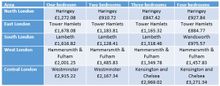 The 'most expensive' table (attached) shows the most expensive scenarios in each area of London. (Assumes one person per bedroom and shows the amount in monthly rent payable per person.)