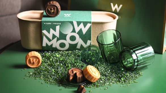除了二款月餅,禮盒內也附贈2款可以在家輕鬆調製的WOOBAR特調酒譜:「MOON BELLINI」呼應「水蜜桃貝里尼」月餅口味,只要將水蜜桃果泥加入氣泡酒,就是一杯清爽美味的貝里尼調酒,「WOW CHOCOLATE MAGARITA」則搭配「貝禮詩海鹽焦糖核桃巧克力」月餅口味,以龍舌蘭為基底,加入貝禮詩奶酒、巧克力和牛奶,打造甜蜜版的瑪格麗特。今年「WOW MOON無限」月餅禮盒外包裝採環保紙漿材質,呼應永續精神,內附2只由春池玻璃設計的「WOOMOON邀月玻璃杯」,以水中撈月為創作靈感,運用月餅的外型輪廓化身為酒杯整體造型,並用香檳瓶的「剔透綠」為主色調,體現回收的精神及對地球的愛護。