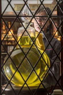 One area of the village which does not require quite as much attention is William White's chemist shop with its assortment of medicine bottles, apothecary jars, quartz carboys, demijohns, pill dispensers and mortars and pestles.