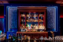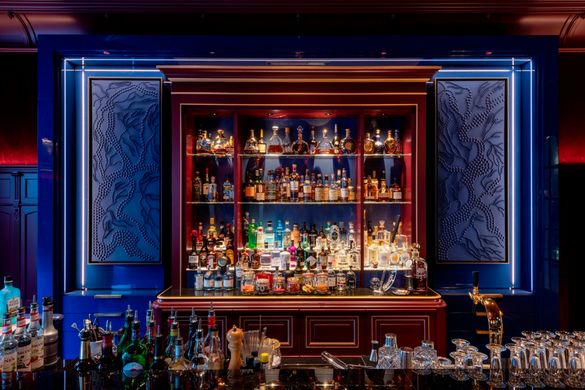 To the other side of the lounge, the Bar has kept its old wood panelling and coffered ceiling, but now has its own unique – and cosy – identity. The highlights of the room are the modern, handmade chandelier called Angela by Charles Paris (a modern tribute to the lobby lounge's historic chandelier) and the side panels of the bar that have been custom made by the renowned French artist Jane Puylagarde, who has created illuminated relieve works of art inspired by the roots of Swiss stone pine. Rich red velvet lines the walls, while the bar top and chairs are adorned with dark blue leather; gold accents add a touch of glamour.