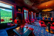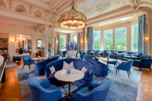 The lobby lounge, with its high ceilings and stunning valley vistas, is the majestic heart of the hotel. Signature components (such as the parquet floor, the grand piano – played daily during afternoon tea and in the evening, the central chandelier that mimics the hotel's crown logo and the antique table beneath it) remain, while the very beautiful frescoes on the ceiling of the lobby that were painted at the beginning of the 20th century by artist Otto Haberer have been refreshed. All serve to remind guests of the grandeur of days gone by. Change comes in the shape of new seating in opulent materials such as velvet, silk and leather (once again in varying shades of blue) that has been placed in a way that makes the room more homely and also allows for more private conversations.