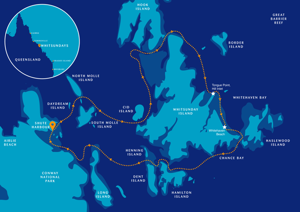The cruise takes in the Molle group of islands, Cid Harbour, Hook Island, Whitsundays Passage, Whitehaven Bay, Hamilton Island, Dent Island and more, as well as stopping off at the popular Tongue Point Hill Inlet and Whitehaven Beach to allow guests to explore more.