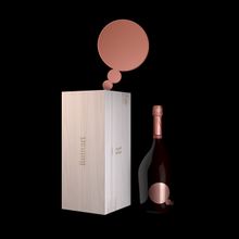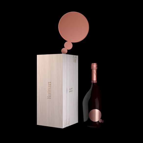 Echoing the sensory installation RIGHT HERE, RIGHT NOW, the Jeroboam wooden box was whitened with chalk taken directly from the walls of Ruinart's chalk pits in Reims, giving the wood a ceruse-like appearance. Instead of the usual Ruinart label, a rosé-coloured mirror label appears on the front of the Jeroboam, with no writing, recalling the bubbles from the art installation.