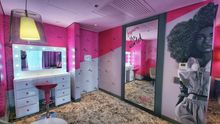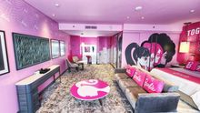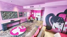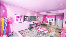 Shades of pink adorn the wall accompanied by patterned graphics, Barbie and her friends and contemporary artwork of the legendary doll. The king bed features a colored headboard with pink and white furnishings atop a faux fur white rug. Guests can unwind on the pull-out couch featuring Barbie throw pillows or prepare for a night of glam and style at the light and bright dressing suite-inspired vanity featuring an amenities kit, including a Barbie doll, tutu and pink glasses. Also, in the suite guests find a robe, slippers, and towels with Barbie's name on them. The expansive bathroom features Barbie graphics throughout and a large dressing mirror. As a pet-friendly suite, four-legged friends can live their Barbie dreams too, enjoying a space created specifically for them atop a shag bean bag chair.