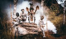 Members of the Skeleton Tribe from Mindima use white paint on their bodies to appear as skeletons. As the story is told now, a few villagers went hunting in the mountains but never returned. A search party found a small cave containing numerous human bones. They believed a big monster (probably a bear or wolf) had killed the hunters. To get rid of the monster they painted themselves as skeletons and laid next to the bones. When the monster returned and had his back to the living skeletons, they killed it. To this day the Skeleton Tribe continues to paint their bodies like skeletons to ward off evil and honor their ancestors.