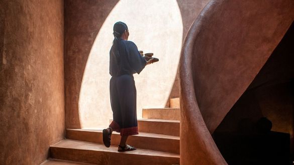 Throughout the property, light is used to create immersive, sensory moments. In the guest rooms, strategically placed low lighting and warm-toned lamps create a serene ambiance, casting gentle shadows that encourage relaxation and calm. As guests descend the spiral red clay staircase that leads to the spa's treatment rooms, they'll be mesmerised by the interplay of light and shadows dancing on the curved walls. The outdoor terraces are adorned with geometric wooden screens, casting intricate patterns across the stone floors as the sun filters through the canopy of trees, while in the evening, soft ambient lighting enhances the silhouettes of the surrounding landscape, giving the resort an ethereal glow.