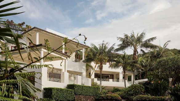 Raes Guesthouses consist of two adjacent buildings, together housing ten spacious suites. Each suite features a luxurious king-sized bed with a custom-designed bedhead, and offers sweeping views of Wategos Beach or the serene garden surrounds. Many of the suites feature private balconies with sun lounges, while others showcase custom French linen canopies. Designed by renowned interior designer Tamsin Johnson, the property radiates a relaxed Mediterranean feel, with earthen pastels in blues and greens, hand-painted joinery, and vintage-inspired pieces throughout. As synonymous with Johnson's design practice, the space features custom furnishings, organically molded plasterwork, and mid-century lighting. This is complemented by a range of carefully chosen materials, from vintage glazed tiles to linen and cane, ensuring every detail feels at home within Byron Bay's coastal surrounds.