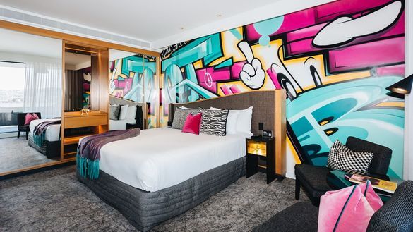 Wellington artist Aidan Walbækken is adding new art to the walls of the hotel's iconic Gallery 4 level, bringing his own take on street art indoors, with a touch of Banksy. “Wellington is a city with a thriving street art culture and bringing it onto a finite space was an interesting challenge that I've hugely enjoyed.