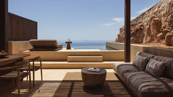 Perched high above the sea on a rugged clifftop, Gundari transcends a place to rest your head while in town – it's a baptism into the island's raw beauty. Every element of the design reflects a deep respect for the landscape, from hand-chiselled stone walls to sun-bleached timber that blends seamlessly with the terrain. There are no over-the-top extravagances here – just the profound luxury of space, serenity, and impeccable attention to detail.