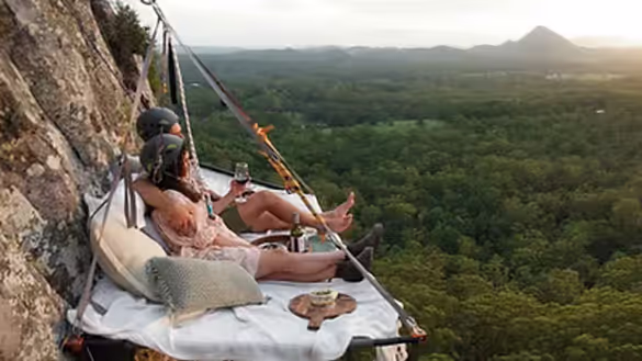 Dining 100 metres above ground with panoramic views of the Noosa Hinterland at sunset, enjoy a gourmet meal or picnic on a secure portaledge for a truly unforgettable experience. noosaadventures.com.au