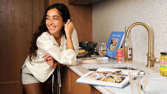 Ellie Bouhadana's kitchen focus: The chef and founder of Ellie's Table brings her Mediterranean heritage and ingredient-driven philosophy to life through a curated hamper with locally sourced snacks including spices, olive oil, pickles, anchovies, chocolates and seed crackers. Guests discover cookware from Our Place, thoughtfully selected tableware including a bespoke ceramic made in partnership with Ellie, Semaine and Four, an array of vintage table linens, all with a recipe card by Ellie based on the hamper contents. The kitchen becomes a space for nourishment, encouraging guests to create their own feast using their room's fully-equipped facilities.