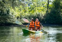 A tranquil paddle across the resort's secluded lagoon, surrounded by lush mangroves and birdlife, offering a serene moment of reflection and togetherness.