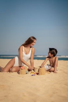 The collection features exclusive swimwear for men, women, and children, complemented by pareos, plush towels, tote bags, and beach toys for little explorers. Each piece is adorned with vibrant illustrations inspired by cherished seaside moments, from building sandcastles under the sun to sailing on open waters, enhanced by a bespoke stripe pattern created exclusively for this collaboration.