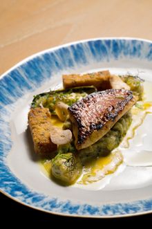 - Red Mullet Fillet in Chilli–Orange Vinaigrette with chickpea fritter and mussel mouclade