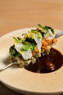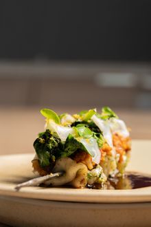 - Fiore di Carciofi with yabbies kofta, arugula mint pesto, and vanilla oil