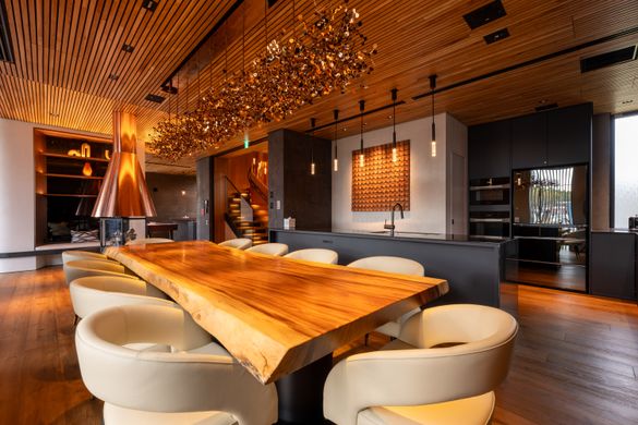 Designed by Japan's top interior architecture firm, Meigetsu Aki Niseko blends modern Japanese elegance with natural textures and rose gold accents. Built in 2025, its curved wooden louvres bring to mind fresh tracks on powder snow, enhanced by the elegance of black stone. Finely-curated furniture, art infused fixtures, and designer appliances imbue the spaces with elegance and an aura of serenity.