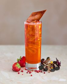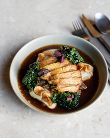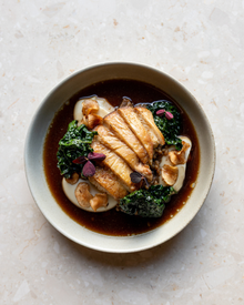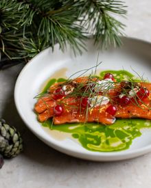 Grilled goose breast with black apples, dehydrated beets and bay leaf glaze precedes the main: roast pork with celery root purée, braised red cabbage, cranberries and spiced gravy, or slow-cooked cod with grilled carrots, kale and sweet currants. Milk chocolate mousse with mandarin granita, buttermilk foam and spruce meringue concludes the journey.