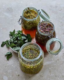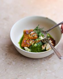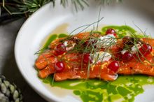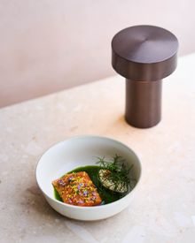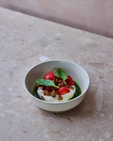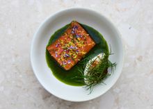 The feast begins with smoked twice-cured lamb with nutmeg emulsion and sweet-sour carrots on caraway-seed leaf bread, followed by cured arctic char with horseradish cream and herbal whey broth (add optional herring platter with geothermal rye bread for ISK 2,490).
