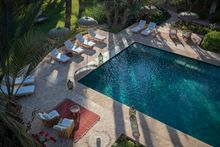Set within gardens planted with over 150 century-old palm, olive, and pistachio trees, the house was formerly owned by Moroccan sociologist Paul Pascon and has long been associated with intellectual and cultural exchange. A recent renovation led by Boccara's disciple Nicolas Bodé alongside Jacques van Nieuwerburgh preserves the building's blend of traditional Moroccan and contemporary aesthetics while introducing modern amenities.