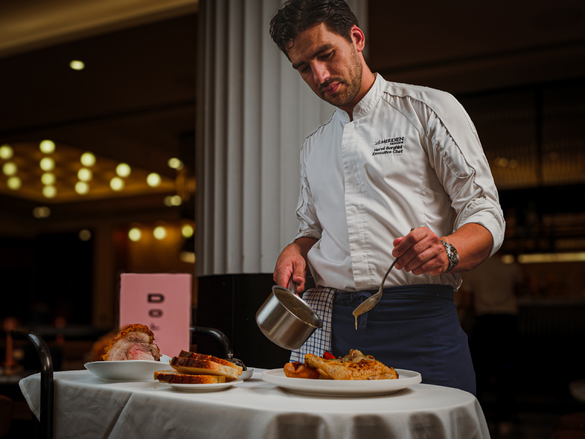Executive Chef Hervé Borghini, Bordeaux-born and Michelin-trained, anchors the menu in tradition. Guests choose from a selection of premium roasts, including Loddon Valley lamb rump, roasted beef striploin and Hazeldene's chicken Maryland, each served with classic accompaniments.