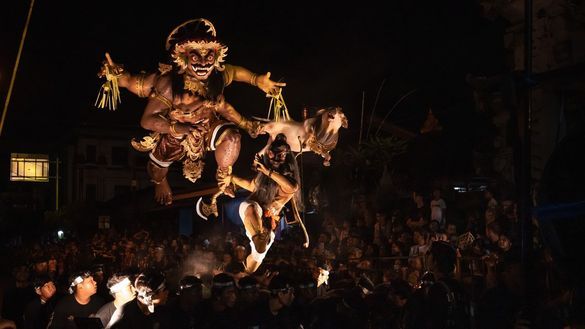 The eve of Nyepi, known as Pengerupukan, marks the transition into stillness through rituals that cleanse negative energy. Guests are invited to take part in Megegobok, an ancestral ritual of rhythmic sound and communal movement that reconnects the body with the earth, followed by the Ogoh-Ogoh procession where symbolic figures are paraded to release human vices before the new year begins.