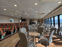• Passenger lounge with a mix of seating options, including booth-style lounges and traditional forward-facing seats
