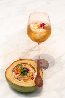 At the TASTE of SAMUI event, Sa-Nga showcased Kao Yum Sa-Nga as a particular highlight. This concept continues at the restaurant itself, where Khao Yum Sa-Nga is introduced as part of the dining sequence, served as an amuse bouche within the sharing menu. The dish features organic green jasmine rice sourced from Sisaket province, harvested slightly early to preserve its delicate vegetal aroma. It is combined with fresh herbs, roots, and aromatic spices, then balanced with palm sugar and fish sauce to create a layered and precise flavour profile.