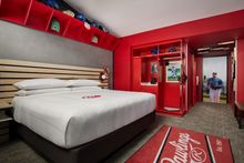 Guests begin their stay walking through the hotel's newly renovated hallways before stepping into a baseball dream. The entrance to The Rawlings Room features a display of Rawlings bats on the walls and ceiling, leading into a clubhouse-inspired bedroom where every detail celebrates baseball. Closets have been transformed into player-style lockers, complete with bats, batting gloves, fielding gloves, helmets, and photos. Above the king-size bed, dugout-style storage and ballgame-inspired lighting create the feeling of being inside a professional team space, while the headboard and side tables are designed to resemble a classic wooden dugout bench.