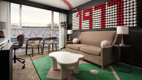 Floor-to-ceiling windows overlook the field and like all the hotel's field view rooms and suites, can be opened to take in the full sights and sounds of the stadium. Specialty furnishings, including an oversized baseball glove chair made of Rawlings leather along with additional leather accent seating, create the perfect setting to watch from the windows or enjoy in-room dining from Sportsnet Grill. A workspace topped with a scoreboard-style television makes watching replays even more exciting, while baseball-inspired art, Gold Glove imagery, and mirrors that let guests imagine themselves as a baseball card blurring the line between hotel stay and baseball fantasy.