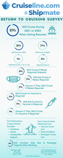 “By a large majority, our survey participants said that they are ready to get back on a cruise ship as soon as possible this year. This shows that there is a tremendous demand out there to cruise again after one year of not sailing, and travelers are feeling confident in the new health measures being implemented by the cruise lines,” said Jamie Cash, General Manager of Cruiseline.com and Shipmate.