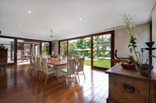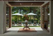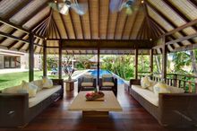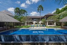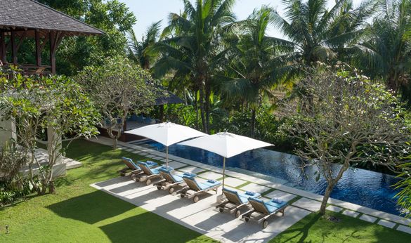 The five-bedroom villa is thoughtfully designed. Traditional Balinese architecture blends seamlessly with contemporary hardwood and stone interiors that flow onto vast balconies, generous gardens and an 18-metre pool shaded by lush coconut palms. There are plenty of indoor and outdoor spaces for entertaining and large ensuite bedrooms to put your feet up.