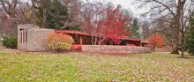 This single-story Usonian home is both functional and beautiful, meeting the needs of its owner decades ahead of the Americans with Disabilities Act accessibility requirements. The modest home is built of Chicago Common Brick and Red Tidewater Cypress. With much of the labor and materials used to build the home sourced locally in Rockford.