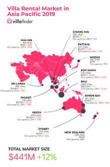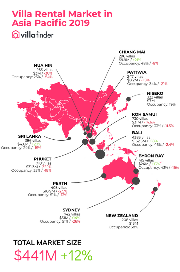 - The overall Asia Pacific market grew by 12% in the past 2 years, reaching US$440m. There's an increase in villa supply across various destinations. Bali is still the biggest market with over 4,000 villas. It is interesting to note that every single market in our study has more villas than 2 years ago as more investors want to tap into the ever-growing vacation rental market.