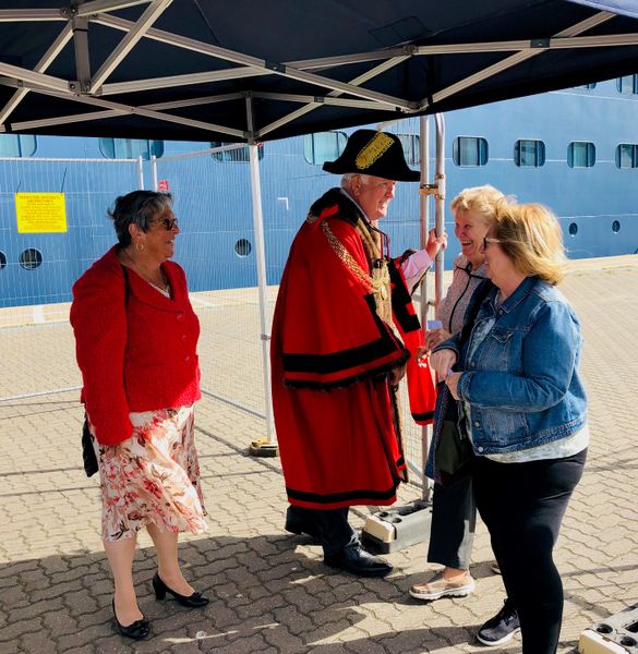 The Mayor of the Great Yarmouth Borough, Councillor Michael Jeal – himself originally from Wallsend, in North Tyneside, but now a Great Yarmouth resident for some 48 years – was on hand with the Mayoress, his wife Paula, wearing the town's impressive Chains of Office, to greet guests, as they disembarked the ship for tours to Norwich and shuttlebuses into town for nearby attractions.