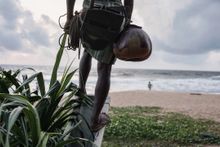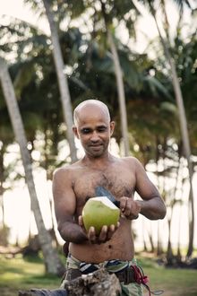 Indika Suresh, pictured right, is one of around 200 full-time toddy tappers working in Sri Lanka today. He started out working in his family's local toddy shop, and 'learnt the ropes' from his father. The job provides enough income for Indika to support his wife and three children, plus a nice little sideline from tourists stopping to take photos of him at work.